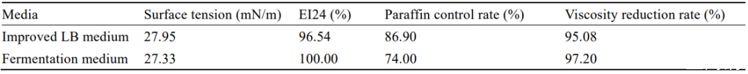 菌液具有较低的表面张力和较高的乳化能力能在提高原油采收率方面起着重要作用。如表1所示,菌株B6发酵上清液的表面张力(27.33 mN/m)显著低于纯水的表面张力(72.80 mN/m),良好的表面活性剂能够显著降低表面张力,可以有效改变油、岩、水的界面状态,有助于提高地层中油相的流动性,从而提高驱油效率。将发酵上清液与液体石蜡混合后,EI24值为100.00%,具有优良的乳化性能,并高于先前单菌或混合菌系的研究结果。如,Liu等测定的地衣芽孢杆菌(Bacillus licheniformis)L20发酵上清液的EI24值为62.00%,魏晓霞等测定了来源于青海油田的混合菌系QZ-10的EI24值为91.11%。因此,以上结果表明菌株B6产生的生物表面活性剂其性能更为突出,具有较高的应用于微生物强化驱油的潜力。