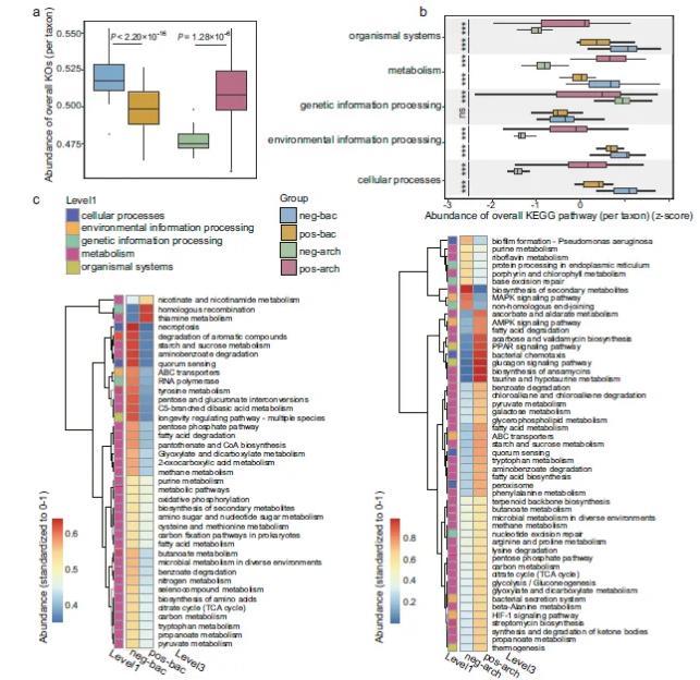 在细菌和古菌中,较小的基因组规模往往与较低的功能基因丰度有关。平均而言,pos-arch组中的类群的KOs和KEGG通路的丰度明显高于neg-arch组中的类群,而细菌中的情况恰恰相反。只有一个例外,即遗传信息处理通路在pos-bac组和neg-bac组之间没有显著差异。