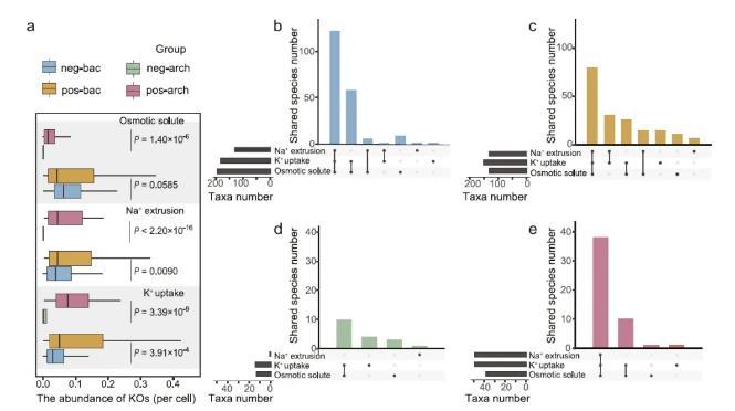与盐敏感类群相比,耐盐细菌和古菌与耐盐相关的KO的丰度都明显更高。这证明了分组的准确性。与丰度不同,细菌和古细菌之间的耐盐机制多样性也存在很大差异。耐盐古细菌往往具有全面的耐盐机制。对于三种最著名的适应性抗盐机制,76%的耐盐古细菌(38个类群)拥有这三种抗盐机制,而只有2%的敏感古细菌(10个类群)拥有这三种机制。细菌类群则呈现出相反的模式。也就是说,pos-bac类群的耐盐机制多样性较低。