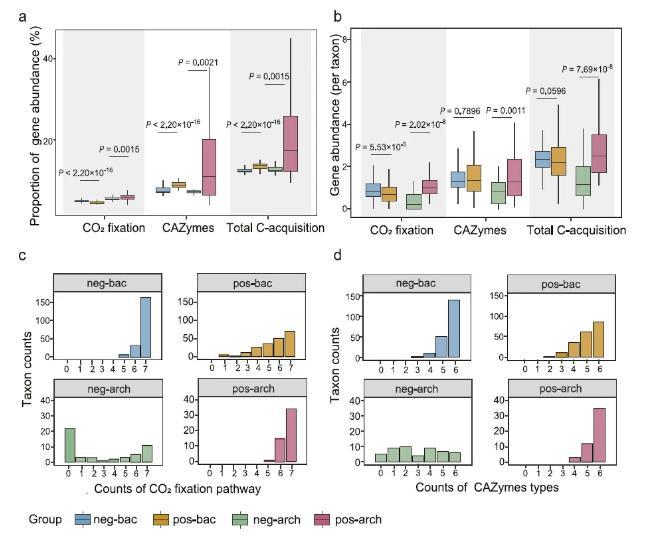 与盐敏感细菌和古菌相比,耐盐细菌和古菌往往含有较高比例的C获取基因。具体来说,pos-bac组的总碳获取基因和碳降解基因的相对丰度为13.49%,而negative-bac组为12.43%。这种模式在古菌中更为明显,正古细菌与负古菌的总碳获取基因比率分别为24.37%与12.65%。pos-arch组和neg-arch组中参与C获取的基因绝对丰度没有明显差异。就古细菌而言,pos-arch组参与C获取的基因绝对丰度明显高于负-古细菌。