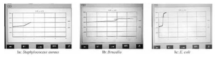 绝大多数细菌是以二分裂方式繁殖,所以可以将生长和繁殖的整个过程分为迟缓期、对数生长期和稳定期。繁殖速度快的菌种一般迟缓期较短,繁殖速度慢的菌种一般迟缓期较长。图1a为本实验室培养出金葡菌生长曲线,葡萄球菌属细菌生长期曲线有一定的倾斜可见迟缓期、对数生长期及稳定期3个阶段,生长期曲线角度较大;图1b是本实验室培养出布鲁菌生长曲线,布鲁菌迟缓期曲线较平坦,3 d左右阳性报警,生长期曲线短,稳定期曲线平坦;图1c是本实验室培养出大肠埃希菌生长曲线,肠杆菌科细菌迟缓期较短,生长期生长迅速,甚至无稳定期。
