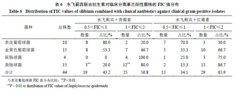 FIC值结果见表5。水飞蓟宾与青霉素联合,对表皮葡萄球菌和金黄色葡萄球菌有相加作用,对屎肠球菌和粪肠球菌是无关作用。水飞蓟宾与红霉素联合,对表皮葡萄球菌和金黄色葡萄球菌分别为协同和相加作用,对屎肠球菌和粪肠球菌是无关作用。水飞蓟宾与环丙沙星联合,对大肠埃希菌和铜绿假单胞菌均为拮抗作用。水飞蓟宾与庆大霉素联合,对大肠埃希菌和铜绿假单胞菌均为无关作用。
