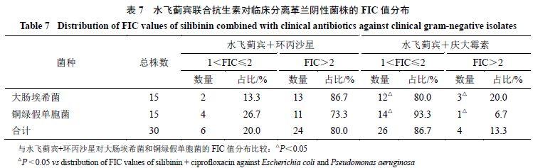 水飞蓟宾与青霉素联合对表皮葡萄球菌、金黄色葡萄球菌、屎肠球菌和粪肠球菌的FIC值分布,与水飞蓟宾与红霉素联合对表皮葡萄球菌、金黄色葡萄球菌、屎肠球菌和粪肠球菌的FIC值分布比较,差异无统计学意义(P>0.05)。水飞蓟宾与环丙沙星联合对大肠埃希菌和铜绿假单胞菌的FIC值分布,与水飞蓟宾与庆大霉素联合对大肠埃希菌和铜绿假单胞菌的FIC值分布比较,差异显著(P<0.05),水飞蓟宾与环丙沙星联合对这2种细菌的联合抑菌效应均以拮抗为主,水飞蓟宾与庆大霉素联合对这2种细菌的联合抑菌效应均以无关为主。