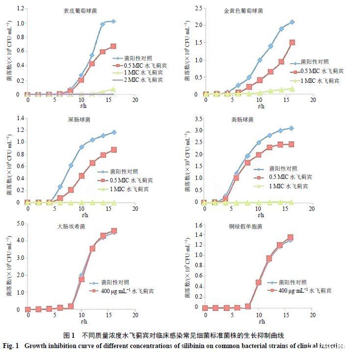 本实验结果表明,水飞蓟宾对表皮葡萄球菌、金黄色葡萄球菌、粪肠球菌和屎肠球菌的生长都有明显抑制作用,抑制效果随药物质量浓度的增加而增加。水飞蓟宾对大肠埃希菌和铜绿假单胞菌的生长没有抑制作用。这也验证了水飞蓟宾能抑制革兰阳性菌生长,而对革兰阴性菌生长无抑制作用。