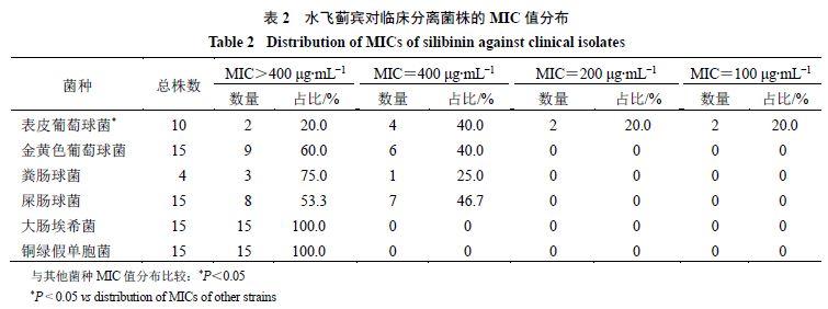 结果见表2。水飞蓟宾对表皮葡萄球菌临床分离菌株的MIC值分布为>400、400、200、100μg/mL,对应菌株占比分别为20.0%、40.0%、20.0%、20.0%;对金黄色葡萄球菌、粪肠球菌和屎肠球菌临床分离菌株的MIC值分布为>400、400μg/mL;对大肠埃希菌和铜绿假单胞菌临床分离菌株的MIC值均>400μg/mL。表皮葡萄球菌的MIC值分布与其他测试菌种比较,差异显著(P<0.05)。