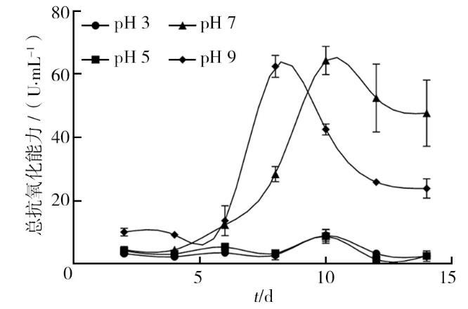 2.3.2 pH值不同pH条件对血红密孔菌培养过程中总抗氧化能力变化的影响较大(图6)。当pH为3和5时,血红密孔菌总抗氧化能力变化趋势基本一致,始终维持在较低水平(10 U/mL以下);当pH为7时,总抗氧化能力从第4天开始迅速增加至第10天,并达最大值64.34 U/mL,随后逐步下降,在第14天降至47.69 U/mL;当pH为9时,总抗氧化能力从第6天快速上升,并于第8天上升至最大值62.49 U/mL,随后快速下降至25.9 U/mL(第12天),然后维持基本不变。综上所述,偏酸环境对血红密孔菌抗氧化能力基本没有影响,而中性及偏碱环境对其影响较大,且对比偏酸环境差异显著。因此,中性及偏碱性环境更能提高血红密孔菌的总抗氧化能力。