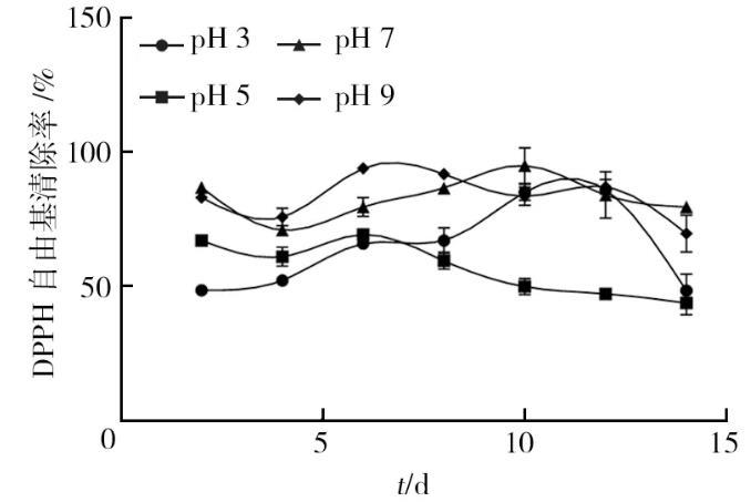 2.2.2 pH值在血红密孔菌生长过程中,不同pH值对其DPPH自由基清除率的变化影响较大(图4)。当pH为3时,DPPH自由基清除率从第2天缓慢上升至第12天,并达到最大值85.96%,于第14天下降至48.46%;当pH为5时,DPPH自由基清除率先波动后下降,总体处于较低水平,最终降至43.75%;当pH为7时,DPPH自由基清除率由第2天的86.83%下降至第4天70.96%,随后缓慢上升并于第10天达最大值94.99%,随后下降,最终降至79.55%;当pH为9时,血红密孔菌对DPPH自由基的清除率一直处于波动状态,在第6天达最大值93.97%,随后处于下降趋势,最终于第14天降至69.73%。综上所述,pH为7时得到的DPPH自由基清除率峰值与其他3组相比最高,为94.99%,其次是pH 9??杉?pH 9和pH 7)条件下,血红密孔菌对DPPH自由基的清除能力较高。