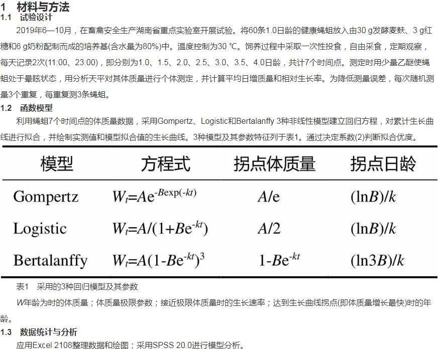 本研究中,通过测定1.0~4.0日龄蝇蛆体质量,并对所测得的数据进行生长曲线拟合,分析其生长发育性能特点和发育规律,旨在为家蝇的进一步选育及有效的饲养管理提供依据。