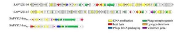 全基因组序列分析结果显示烈性噬菌体SAPYZU-04和SAPYZU-15基因组全长分别为140 584 bp和135 178 bp,而温和噬菌体SAPYZU-SapM13和SAPYZU-SapM14的基因组全长分别为44 922 bp和44 232 bp。其中噬菌体SAPYZU-04的GC含量为31.48%,预测到188个ORFs;噬菌体SAPYZU-15的GC含量为29.90%,预测到187个ORFs;噬菌体SAPYZU-SapM13的GC含量为33.98%,包含71个ORFs;噬菌体SAPYZU-SapM14的GC含量为33.89%,包括73个ORFs。
