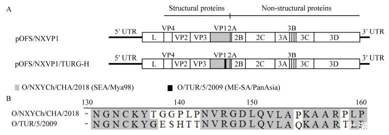 以pSK-Z123/NXVP1为骨架,替换FMDV疫苗株O/TUR/5/2009(KP202878.1,ME-SA拓扑型)长约30个氨基酸G-H环基因的半长质粒pSK-Z123/NXVP1/TURG-H,由苏州金唯智生物科技有限公司合成。pSK-Z123/NXVP1/TURG-H和嵌合全长质粒pOFS/NXVP1经SpeⅠ和BglⅡ双酶切后分别回收约5 400 bp(pSK-Z123/NXVP1/TURG-H)和2个大小均接近3 000 bp(pOFS/NXVP1)的DNA片段,然后用T4 DNA连接酶连接、转化,构建重组全长质粒pOFS/NXVP1/TURG-H。全长质粒用PstⅠ进行酶切鉴定,将符合预期的质粒送苏州金唯智生物科技有限公司进行测序验证。重组质粒含FMDV的基因组示意见图1A,G-H环氨基酸差异见图1B。