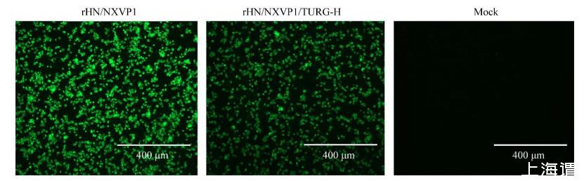 收集的转染样品以VP1-F和VP1-R为引物,RT-PCR扩增VP1结构蛋白基因。琼脂糖凝胶电泳显示扩增出符合预期大小的白亮条带。对该PCR产物进行序列分析,结果表明重组病毒rHN/NXVP1/TURG-H含有替换的基因片段,说明成功构建了重组FMDV。