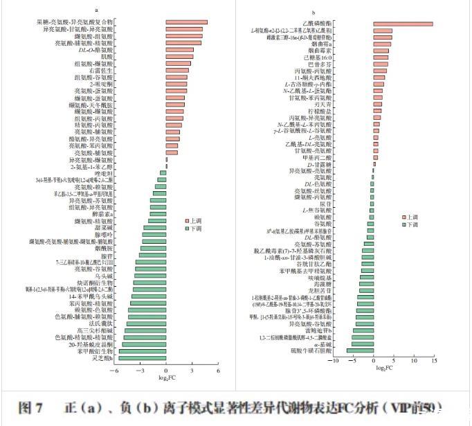 OPLS-DA模型得到的变量权重值(VIP)表示变量投影重要度,值越大,表示越重要。本实验以VIP>1和P<0.05为显著性差异代谢物的筛选标准,正离子模式下筛选到670种显著性差异代谢物,负离子模式下筛选到232种显著性差异代谢物,由于筛选到的差异代谢物过多,且表格无法直观地显示这些代谢物的FC,因此,选择VIP值前50的差异代谢物,以柱状图形式展示鉴定到的显著性差异代谢物的FC变化,结果如图7所示。可以看出,与硫乙醇酸盐液体培养基相比,Akk在优化培养基中发酵后,正离子模式下22种代谢产物显著上调,28种代谢产物显著下调,负离子模式下显著上调代谢产物22种,显著下调代谢产物28种。后续将对这些显著性差异代谢产物进行分析。