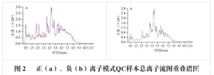 为评价仪器的稳定性及数据质量的可靠性,分别在正负离子模式下将QC样本总离子流图进行谱图重叠比较,结果如图2所示。结果表明两种模式下各色谱峰的响应强度和保留时间均基本重叠,说明在整个实验过程中仪器误差引起的变异较小,实验结果较为可靠。