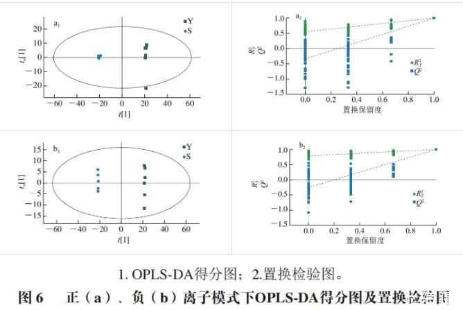 OPLS-DA得分图及OPLS-DA置换检验如图6所示,t能最大程度反映组间差异,而to则反映组内变异??梢钥闯鯫PLS-DA模型可显著区分两组样本,且组内差异较小,结果与PCA模型一致。经7次循环交互验证得到模型评价参数R2Y、Q2,通常情况下Q2>0.5即表明模型稳定可靠。该模型正、负离子模式下的Q2分别为0.998、0.999,均大于0.5。在置换检验中,随着置换保留度逐渐下降,随机模型的R2和Q2均逐渐下降,说明原模型不存在过拟合现象,模型稳定性良好。