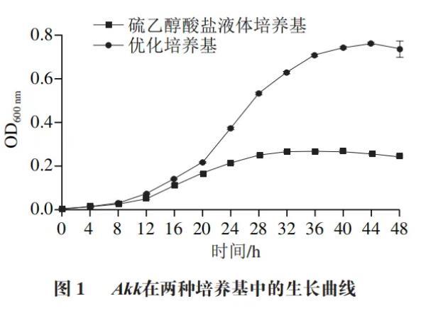 由于Akk在硫乙醇酸盐液体培养基中生长其菌液密度极低(生长速度慢且活菌数较少),因此本课题组前期在硫乙醇酸盐液体培养基的基础上,对Akk培养基进行优化。为确定Akk在两种培养基中的生长稳定期以制备发酵上清液样本,并对比Akk在两种培养基中的生长情况,通过测定菌液OD600 nm并绘制生长曲线,结果如图1所示。