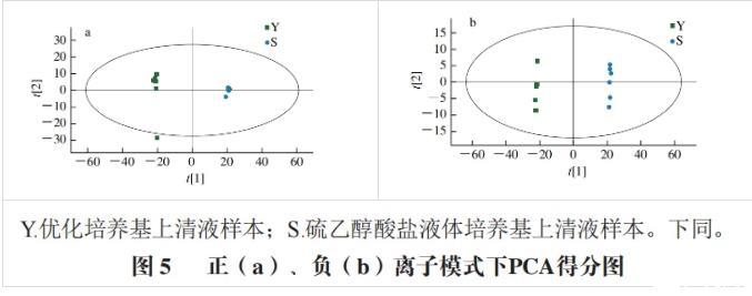 多维统计分析可以从总体水平反映组间差异以及组内的变异度,常采用的方法包括PCA和OPLS-DA。将鉴定到的所有代谢物重新线性组合得到PCA模型,采用PCA方法,能从总体上反映样本的总体分布趋势和组件样本的差异度。两组样本的PCA得分图如图5所示。