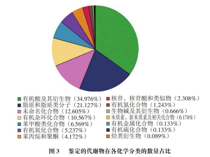 两组样本中检测到的代谢物包括有机酸及其衍生物(34.976%),脂质和脂质类分子(21.127%),有机杂环化合物(10.567%),苯甲酸类(6.569%),有机氧化合物(5.237%),苯丙烷和聚酮(4.172%),核苷、核苷酸和类似物(2.308%),有机氮化合物(1.243%),生物碱及其衍生物(0.666%),木质素、新木质素及相关化合物(0.178%),有机金属化合物(0.133%),有机硫化合物(0.133%),烃类衍生物(0.089%)和未命名化合物(12.605%)等。