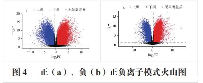 图5中椭圆代表95%置信区间,同一颜色的点表示组内的各个生物学重复,由点的分布状态可以看出,该模型可以区分两组样本,组间样本的数据点很好地集中在一起。PCA模型参数R2X越接近1表明模型越可靠,正、负离子模式下的模型解释率R2X分别为0.835和0.855。结果表明该模型稳定可靠,实验重复性好,随机误差较小,可进一步对样本进行差异性分析。