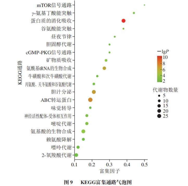在生物体内不同代谢物需要相互协调行使其生物学功能,基于KEGG通路分析有助于更进一步了解其生物学功能。为了解Akk在不同培养基中代谢产物含量变化的机制,将正负离子模式下检测到的显著性差异代谢物整合后进行KEGG通路注释,并根据P值选择显著性最高的前20条KEGG通路进行富集,富集结果以气泡图的形式显示,结果如图9所示。