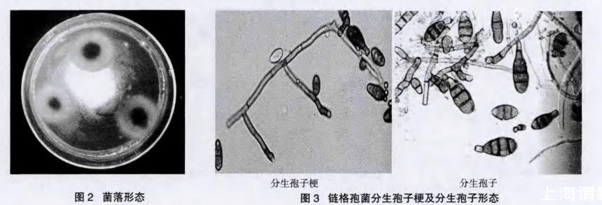 如图2所示,在PDA培养基上菌落圆形,中部黄褐色至黑色,边缘为乳白色,短绒状。从图3看出,分生孢子梗褐色至暗褐色,分支或不分支,有隔。分生孢子棒状或倒棒状,暗褐色,0~3个纵隔,1~6个横隔。根据病原菌的形态特征,鉴定该病原菌为半知菌亚门、丝孢纲、丝孢目、暗色孢科、链格孢属真菌。