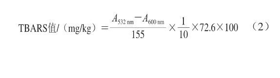 将鱼肉研碎后,称取10 g样品放入锥形瓶中,再加入50 mL含0.1 g/100 mL乙二胺四乙酸的7.5 g/100 mL三氯乙酸溶液,置于加热至70℃的振荡器中振荡30 min,取出静置冷却后过滤,取上清液5 mL加入0.02 mol/L TBA溶液,在90℃的水浴锅中加热45 min,取出静置冷却至室温后,加入5 mL氯仿,充分混匀,静置至溶液分层。分别在532 nm和600 nm波长处测定上清液吸光度。TBARS值按式(2)计算: