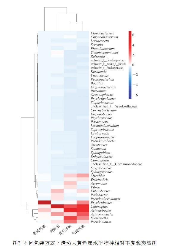 图7不同包装方式下清蒸大黄鱼属水平物种相对丰度聚类热图