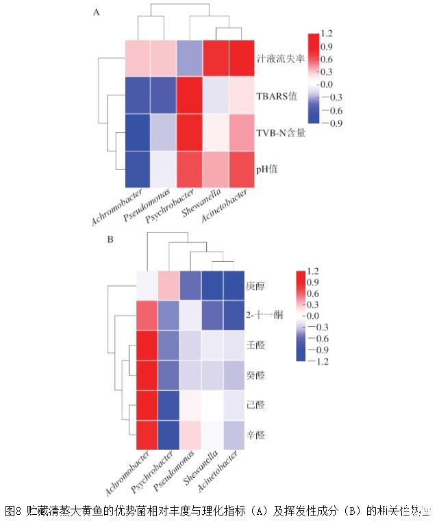 图8贮藏清蒸大黄鱼的优势菌相对丰度与理化指标(A)及挥发性成分(B)的相关性热图
