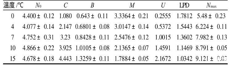 Gompertz方程是一个双指数函数,被认为是较为准确拟合微生物生长的一级模型。运用SAS软件拟合不同恒定温度下冷鲜肉中热杀索丝菌的生长。由表2可以看出,判定系数R2的值较高,并且随温度升高R2值逐渐增加,表明Gompertz模型能很好的描述不同温度下热杀索丝菌的生长,尤其对较高温度的拟合更为理想。利用Gompertz模型求得的热杀索丝菌生长动力学参数见表3,可以看出0、4℃时最大比生长速率较低,延滞期较长,热杀索丝菌的生长处于抑制状态,当温度升高到15℃时比生长速率急剧增加,延滞期缩短为1.034d。