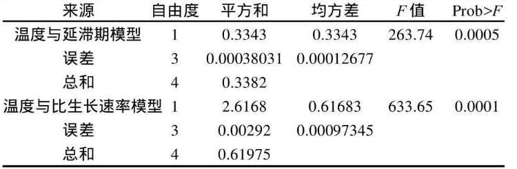 用平方根模型拟合温度对微生物生长的影响。图2是应用平方根模型拟合温度与比生长速率的关系。图3是应用平方根模型拟合温度与延滞期的关系。用F统计量检验模型总体的显著性,表4为模型的方差分析结果。可知温度与比生长速率和延滞期之间存在良好的线性关系,温度作为影响微生物生长的栅栏因子具有重要的实际意义。温度与比生长速率的模型为方程(5),温度与延滞期的模型为方程(6)。