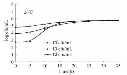 26℃下,Gompertz模型拟合的不同浓度LM在营养肉汤中的生长曲线见图2。菌的延滞期随初始菌浓度的增加而缩短,初始菌浓度为102cfu/mL的曲线在约5h进入对数期,而103和104cfu/mL的生长曲线分别在约3和2h后就进入了对数期。和4℃时一样,进入对数期的LM,生长速率随着初始菌浓度的增加而减慢,初始菌浓度越低,对数期菌数增加速率越快。25h后,三个不同菌浓度的生长曲线达到最大菌体密度,约为105cfu/mL。