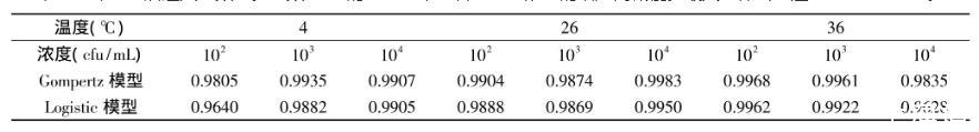 表1不同浓度LM菌悬液的Gompertz模型和Logistic模型在不同温度下的相关系数(R2)
