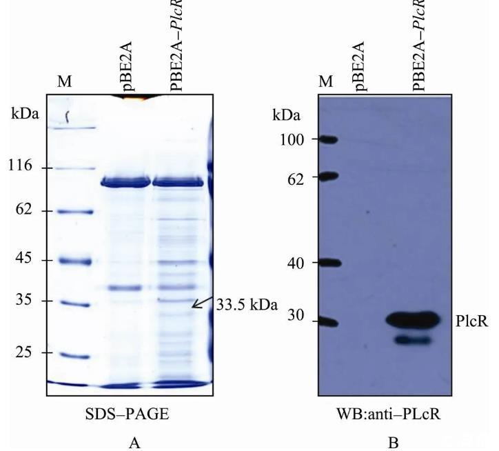 挑取pBE2A/A16R和pBE2A-/A16R单菌落,LB培养基中培养13 h后,取菌体1 mL进行SDS-PAGE分析(图2A),并使用抗PlcR多克隆抗体检测PlcR是否在炭疽芽胞杆菌中A16R中表达。结果显示,pBE2A-/A16R所在的泳道有一条明显的杂交条带,与PlcR大小相符(33.5 kDa),因而确定PlcR在炭疽芽胞杆菌中A16R中得到表达(图2B)。