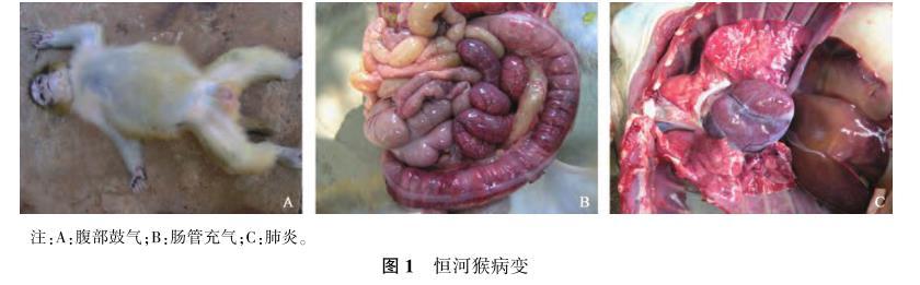 该恒河猴身体健康,由人工饲养,每日喂以基础饲料,自由饮水。每日清洗猴笼,定期消毒。通过日常饲养观察发现该恒河猴表现为呼吸困难,精神沉郁,厌食,活动减少等症状,立即转入治疗室单笼饲养及治疗,静脉输液青霉素(80万单位/次)3 d后病情好转,停药观察,该猴精神及饮食情况并未完全恢复。在治疗室内隔离观察20 d后放回大笼饲养,于放回大笼第2天死亡。尸检外观可见腹部鼓气(见图1A),解剖心脏、肝、脾、胰腺、肾、肾上腺、膀胱未见异常,胃、肠管内充气(见图1B),部分肠道呈出血性炎性变化,双肺下呈充血、出血,边缘部分肉样肺炎病变(见图1C)。