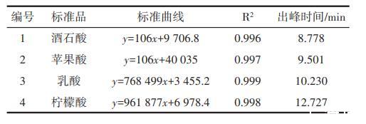 表1 4种有机酸标准曲线的回归方程及相关系数