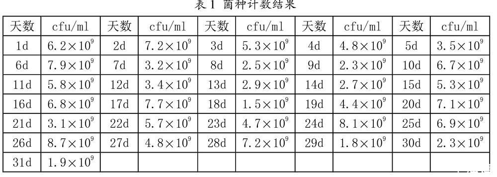 由表1可以看出,大肠埃希菌在4°C冰柜里贮藏,连续31天的菌落数范围在1.5×109cfu/ml~8.7×109cfu/ml之间。