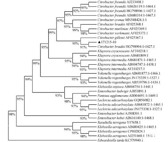 16S rDNA鉴定:对分离菌株171215-10的16S rDNA基因进行PCR扩增和测序,并基于16S rDNA序列构建系统进化树,结果显示,分离株171215-10与布氏柠檬酸杆菌聚为一支(图2)。