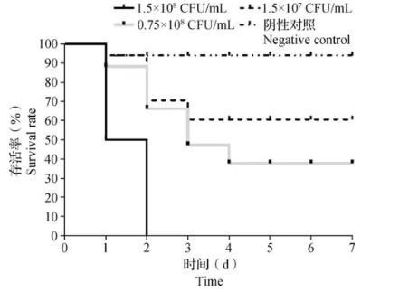 结果如图4所示,1.5×108CFU/mL组斑马鱼在注射菌悬液后2 h开始出现死亡,至第2天时全部死亡,累计存活率为0%;0.75×108CFU/mL组斑马鱼在注射菌悬液后第5天不再死亡,累计存活率为30%;1.5×107CFU/mL组斑马鱼在注射菌悬液后第3天不再死亡,累计存活率为40%;阴性对照组第2天不再死亡,累计存活率为90%;分别从阴性对照组和各试验组死亡的斑马鱼体内分离得到菌株,经细菌鉴定,除阴性对照组外,其余各试验组菌株与注射菌株171215-10一致。
