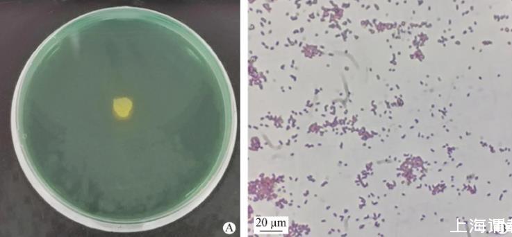 图1分离菌株的菌落形态(A)和革兰染色(100×)观察(B)