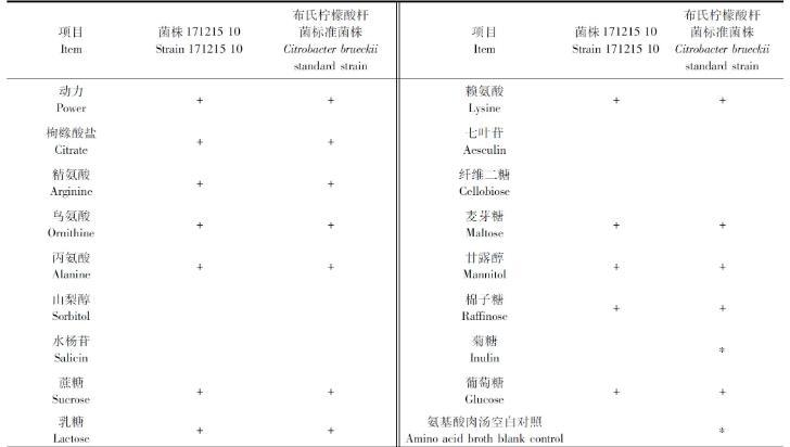 生化鉴定:根据分离菌株171215-10的生化鉴定试验结果(表1),结合《伯杰细菌鉴定手册》和Brenner等的研究,鉴定该菌株为布氏柠檬酸杆菌。