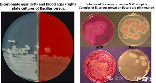 培养鉴定:5%羊血琼脂、巧克力琼脂、常规血液培养基和营养肉汤,35℃环境下,通常24小时内可见菌落生长。菌落特征大型羽毛状、扩展性强、暗灰颗粒状、蔓延快、表面粗糙且呈棉絮状,边缘不规则,且为β溶血性。分离可采用选择性培养基,如MYPA(甘露醇、卵黄、多粘菌素、酚红、琼脂)或PEMBA(多粘菌素、卵黄、甘露醇、溴甲蓝琼脂)。利用蜡样芽孢杆菌在卵黄琼脂上磷脂酶C阳性的特性、不发酵甘露醇,以及添加吡哆醇或多粘菌素作为选择性试剂。