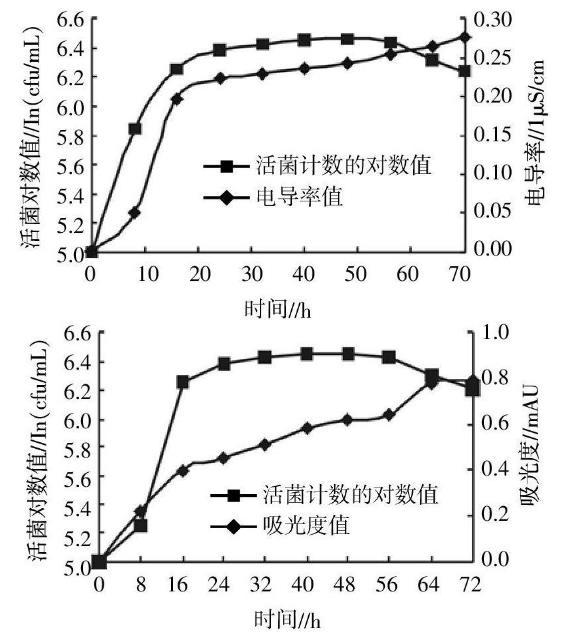 分别采用活菌稀释计数法、电导率法和比浊法对泰乐菌素降解菌的生长曲线进行测定,结果如图1,图2所示?;罹∈图剖ú舛ǖ慕到饩で叻舷妇さ母鞲鼋锥危海啊福栉到饩さ难映倨?,8~24h为对数生长期,24~56h为稳定期,56~72h为衰亡期。电导率法测定的生长曲线也有明显的延迟期、对数生长期和稳定期,且延迟期和对数生长期的时间范围和活菌稀释计数法相似,但此法所测到的稳定期为24~72h,无衰亡期。而分光光度法的生长曲线始终保持上升状态,无明显的延迟期、对数生长期、稳定期和衰亡期。