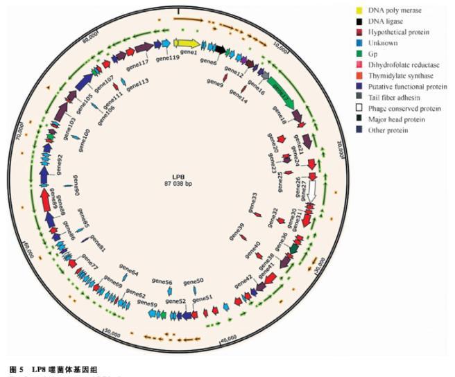 经测序,噬菌体LP8的基因组为87 038 bp,共有120个编码基因,编码基因的累加长度为76 326 bp、编码基因的平均长度为636 bp、编码区域长度占基因组的比例为87.69%。通过SnapGene软件对全基因组进行绘图,分析其基因的大小和分布情况。通过COG、KEGG、GO对LP8的基因进行注释,发现有6个编码基因参与原噬菌体合成;有20个编码基因参与噬菌体有关的生物过程;11个编码基因参与分子功能,如结合或催化;8个编码基因参与噬菌体的合成,具体生物学通路最多的为嘌呤代谢和嘧啶代谢(图5)。