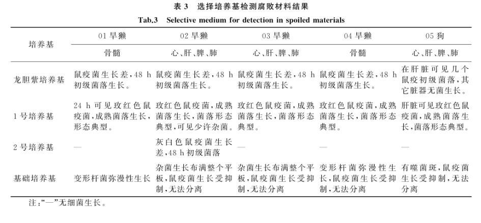 应用选择培养基检测腐败材料中鼠疫菌,结果见表3。