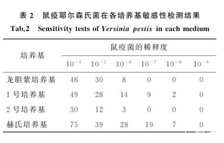 鼠疫菌在龙胆紫培养基和2号培养基敏感性差,鼠疫EV菌液浓度为10-7时,未见鼠疫菌生长,1号培养基在10-8时依然有菌生长,其敏感性与赫氏培养基一致,见表2。