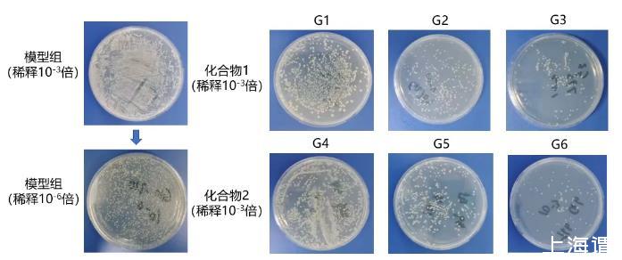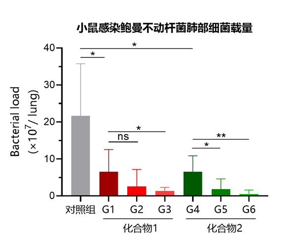 与对照组相比,化合物1和化合物2均能显著降低鲍曼不动杆菌感染后小鼠肺部的细菌载量(P<0.05),且这种治疗效果具有剂量依赖效应。在不同剂量的化合物1和化合物2中,高剂量化合物2(G6)的治疗效果最好(P<0.01)。
