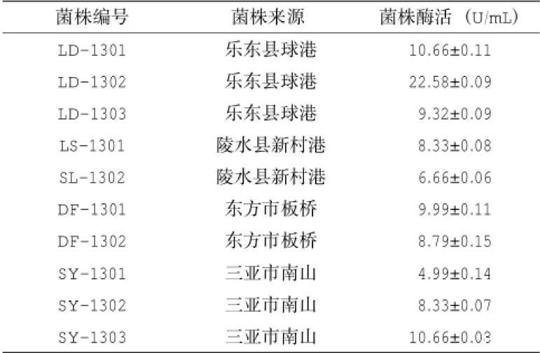 从罗丹明B初筛固体培养基上筛选得到10株水解圈较大的菌株,这些菌株在350 nm紫外灯下观察,在菌落周围均有明显的橙黄色荧光圈(图1)。重复3次摇瓶发酵后,10株菌的产脂肪酶活性存在一定的差异(表1),其中菌株LD-1302的产脂肪酶活性最高,酶活达(22.58±0.09)U/mL。发酵24 h后,LD-1302培养基表面存在不溶于水且浮在水面的絮凝状乳白色蜡样物质,48 h后该絮凝状乳白色蜡样物质消失。