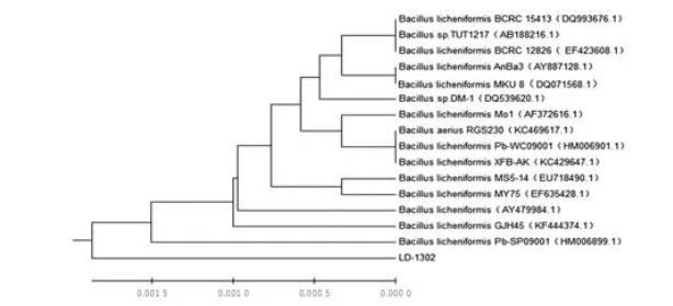 以菌株LD-1302的DNA为模版,经细菌16SrDNA通用引物扩增获得序列长度为1 512 bp的基因片段,对其测序并提交Genbank核酸序列数据库。同源性分析结果表明,菌株LD-1302的16S rDNA基因序列与Genbank中的BCRC 15413等15株芽孢杆菌属细菌的同源性达99.9%以上,利用MEGA 6.1构建系统进化树,结果表明该菌株与地衣芽孢杆菌B.licheniformis聚为一支(图2)。初步鉴定菌株LD-1302为地衣芽孢杆菌。