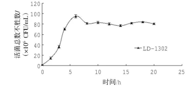 地衣芽孢杆菌LD-1302在以橄榄油为唯一碳源的生长培养基中延滞期较短,培养6 h活菌总数达到最高,为(94.67±3.21)×106CFU/mL,LD-1302在6~20 h内生长较为稳定,表明该菌株可利用有机碳源橄榄油,并在6 h时将培养基营养物质基本消耗殆?。ㄍ?)。