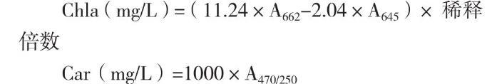 1.2.7脂溶性光合色素测定取10 mg藻粉,置于10 mL玻璃离心管中,加入5 mL丙酮,避光冰浴搅拌提取1-2 d,直至藻体变白,3 000 r/min离心10 min收集上清得到色素提取液。采用分光光度法在662 nm、645 nm和470 nm下测定叶绿素a、总类胡萝卜素含量[27-28],由下列公式计算: