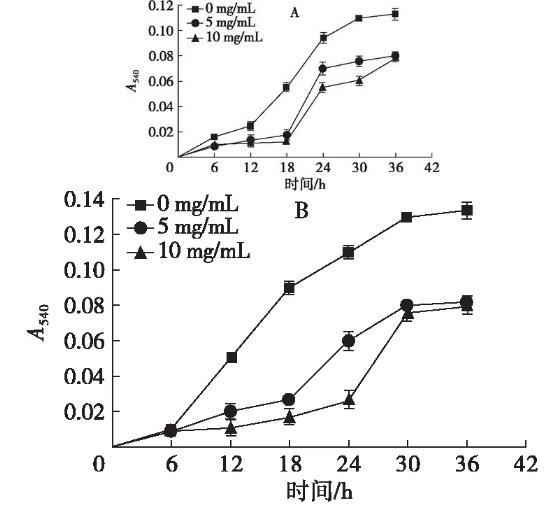 由图2可知,抗四环素大肠杆菌组和大肠杆菌组的生长曲线趋势趋于一致。不添加OLE时,培养6 h后细菌数开始快速增长并进入对数生长期。当OLE质量浓度为5 mg/mL时,抗四环素大肠杆菌和大肠杆菌的对数生长期为18~30 h,此时对数生长期被延缓,细菌生长速率减慢且所需时间范围变宽。当OLE质量浓度为10 mg/mL时,抗四环素大肠杆菌和大肠杆菌在培养18 h后细菌数迅速增加,在18~30 h为对数生长状态,但菌体浓度低于5 mg/mL组。图2(A)表明添加OLE既可以延缓抗四环素大肠杆菌进入对数生长期的时间,又可以降低其菌体生长量,OLE对该菌株有较强的抑制作用。图2(B)表明OLE对大肠杆菌的抑制作用相对较弱。油橄榄叶中酚类物质具有抗肿瘤、抗癌作用,此外还有广泛的抑菌和抗氧化作用,如橄榄苦苷、芦丁、咖啡酸等及其一定比例混合物均显示较强的体外活性,具有联合抗菌作用。Lee等[14]发现橄榄叶提取物中的橄榄苦苷和咖啡酸均表现出对微生物的抑制作用,且组合酚类化合物的抗菌效果显着高于酚类化合物单体。